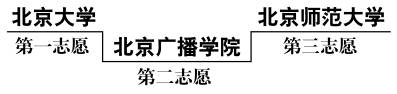 很明显,在北大稳坐第一把“交椅”的情况下,能够进入或接近北大调档分数线的考生,在被北大退档后,单从级差看,有可能被第二志愿校--北京广播学院录取,他们之间分数相差较多,可是第三志愿校的调档线比第二志愿校还高,等于瞎填,凑数而以。浪费了一个虽然渺茫,但也是机会的填报名额。
