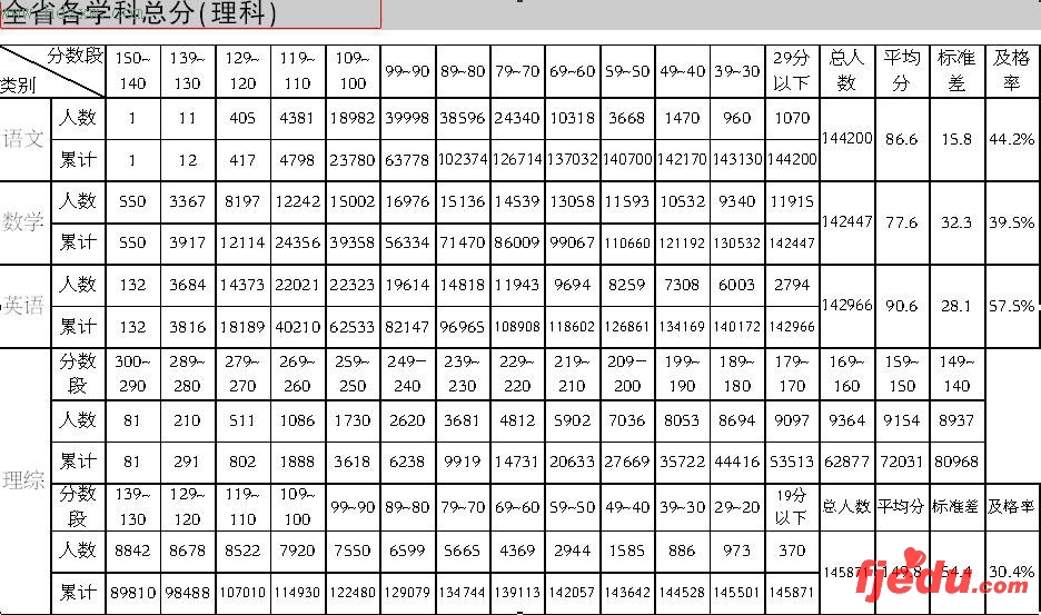 去年我省高考理工类本一批(重点本科)分数线为561分,此次省质检理科考生在560分以上的有10962人,占理科考生总数的7.7%;去年理工类本二批(一般本科)分数线为490分,此次省质检理科考生在490分以上的有36188人,占25.3%;去年理工类本三批分数线为441分,此次省质检理科考生在440分以上的有59713人,占41.7%。
