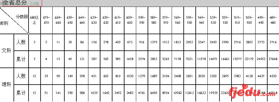 去年我省高考理工类本一批(重点本科)分数线为561分,此次省质检理科考生在560分以上的有10962人,占理科考生总数的7.7%;去年理工类本二批(一般本科)分数线为490分,此次省质检理科考生在490分以上的有36188人,占25.3%;去年理工类本三批分数线为441分,此次省质检理科考生在440分以上的有59713人,占41.7%。