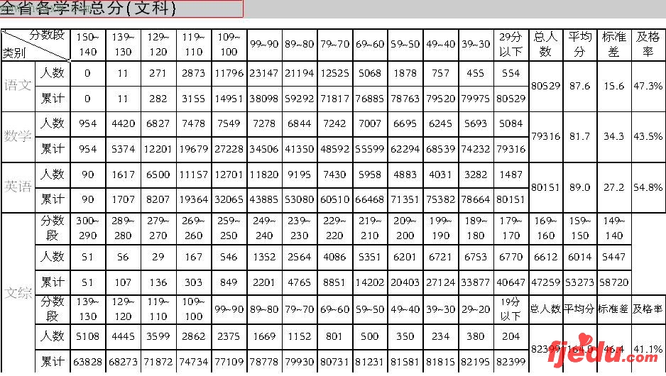 去年我省高考文史类本一批(重点本科)分数线为574分,此次省质检文科考生在570分以上的有5365人,占文科考生总数的6.7%;去年文史类本二批(一般本科)分数线为514分,此次省质检文科考生在510分以上的有19377人,占24%;去年文史类本三批分数线为481分,此次省质检文科考生在480分以上的有27668人,占34.3%。