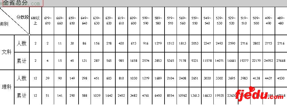 去年我省高考理工类本一批(重点本科)分数线为561分,此次省质检理科考生在560分以上的有10962人,占理科考生总数的7.7%;去年理工类本二批(一般本科)分数线为490分,此次省质检理科考生在490分以上的有36188人,占25.3%;去年理工类本三批分数线为441分,此次省质检理科考生在440分以上的有59713人,占41.7%。