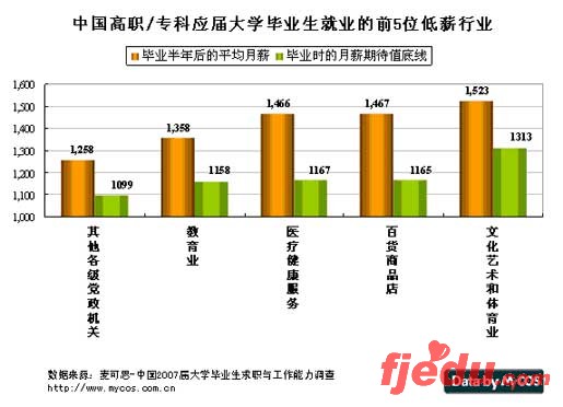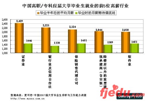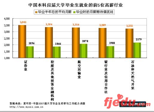 金融证券行业是2007届大学毕业生就业的主要高薪行业,教育业是中国大学毕业生中薪资最低的行业。
