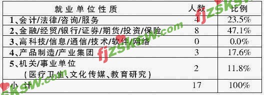 2008年上海1580名毕业生中,选择读研究生的587人(其中赴国外读研究生303人),选择就业的993人。我们把就业流向分为5类(见下表),依次是“会计/法律/咨询/服务、金融/经贸/银行/证券/期货/投资/保险、高科技/信息/通信/技术/软件/网络、产品制造/产业集团、机关/事业单位(医疗卫生、文化传媒、教育研究)”。而就业去向中所谓最热门的第1、2类,占了一半比例以上。