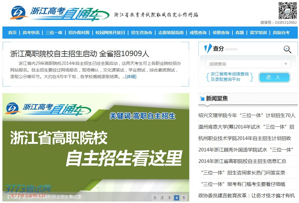 2013年浙江在线高考频道全新推出“浙江高考直通车”公众微信(gk85310982),及时快速地将品牌栏目中的高考政策、院校招生动态、招办主任面对面访谈视频、招生咨询会实况等资讯,以微信形式推送到考生手中,利用新媒体手段全力打造浙江高考第一信息平台。