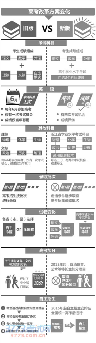 浙江在线09月05日讯 (钱江晚报记者 王玲瑛 徐洁 通讯员 董箫乐)千呼万唤的高考改革方案,昨天上午终于亮相,成为教育部公布的“国务院关于深化考试招生制度改革的实施意见”(以下简称“意见”)中最受瞩目的焦点。