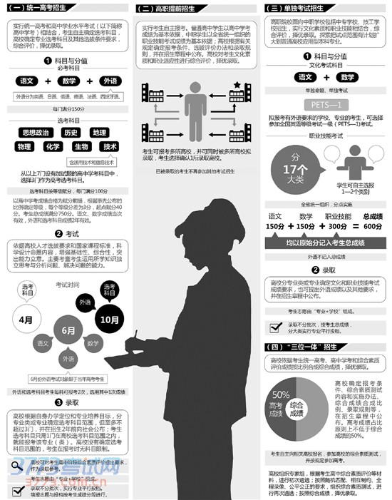 浙江在线09月20日讯(钱江晚报记者王玲瑛)浙江的高考招生改革,核心理念是在确保“公平、公正”的前提下,“扩大教育的选择性”。“选择”成为本次高考改革最亮的关键词,将体现在今后的统一高考招生、高职提前招生、单独考试招生及“三位一体”招生四种考试当中。高考改革究竟改了什么,以下我们为您一一梳理。