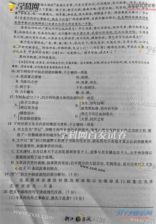 3773考试网2016高考浙江高考正文