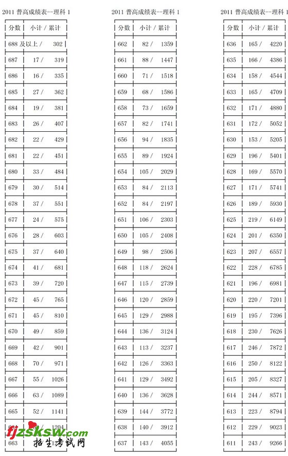 [组图]浙江2011高考理科第一批成绩分段表