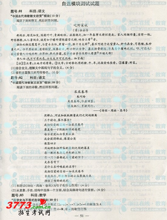 [组图]2012年浙江高考自选模块测试试题及答案