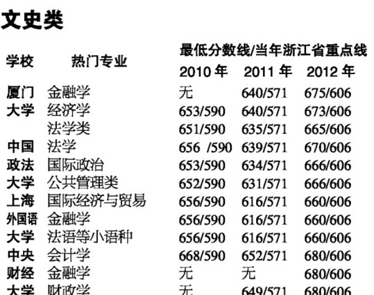 浙江财经大学:招办老师提供了他们近两年面向浙江的一本投档分数线:2011年一批投档线为602分,高出一本线31分;2012年一批投档线为638分,高出一本线32分。
