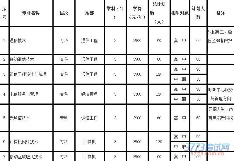 (一)学费标准:通信技术、移动通信技术、光通信技术、通信工程设计与管理、移动互联网应用技术、计算机网络技术每年每生3900元;电信服务与管理专业每年每生3500元。