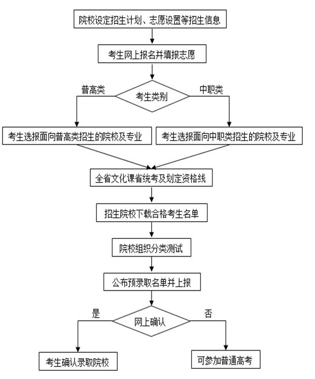 第十三条 学院分类考试招生的工作流程为:考生到地市报名→参加全省文化素质考试→达线参加学院职业技能测试→预录取→考生确认→最终录取。详细流程图见附件1。