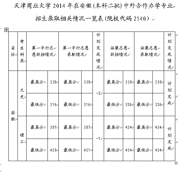 [图文]2014天津商业大学安徽二本中外合作录取分数线情况