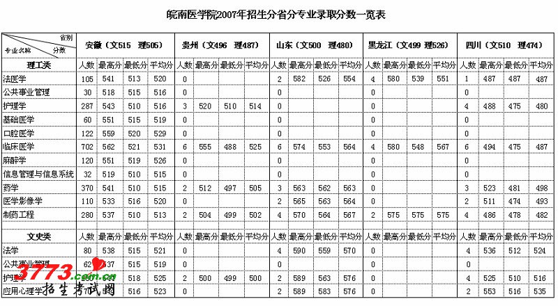 [图文]皖南医学院2007年分省分专业录取分数线