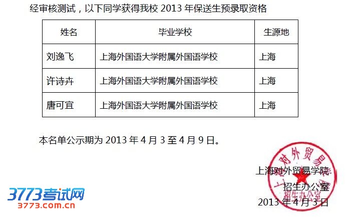 相关文章 2014上海对外贸易学院高考录取查询入口上海对外贸易学院2014年本专科招生章程上海对外贸易学院2013年一本录取专业名单2013上海对外贸易学院录取查询方式上海对外贸易学院2013年招生简章上海对外贸易学院录取分数线查询上海对外贸易学院2009年各省录取分数线上海对外贸易学院2010年各省录取分数线上海对外贸易学院2011年各省录取分数线上海对外贸易学院2012年保送生预录取资格名单查 触屏版 电脑版 3773考试网 琼ICP备12003406号-1