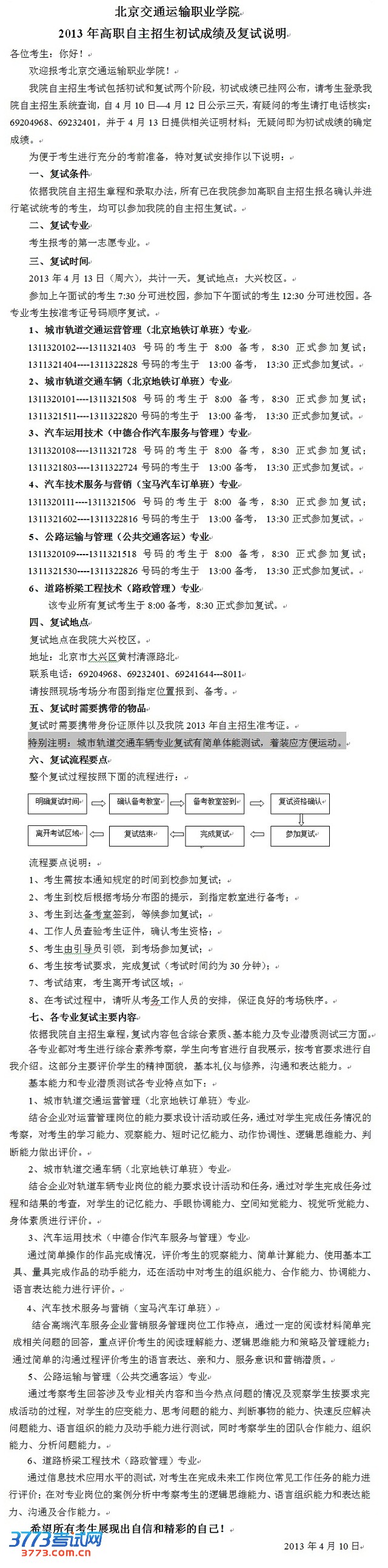 [图文]2013北京交通运输职业学院自主招生成绩查询复试说明