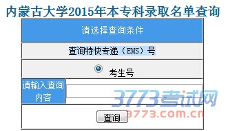 3773高考网讯 2015年高考录取陆续进行,考生可以登录内蒙古大学本科招生网查询录取结果。按内蒙古大学录取规则被录取的考生,则显示内蒙古大学录取的专业,未被录取的考生则显示“未录取”。