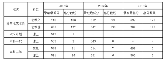 备注:提前批录取分数为美术统考成绩加高考(微博)文化课成绩总分,“-”表示未招生。