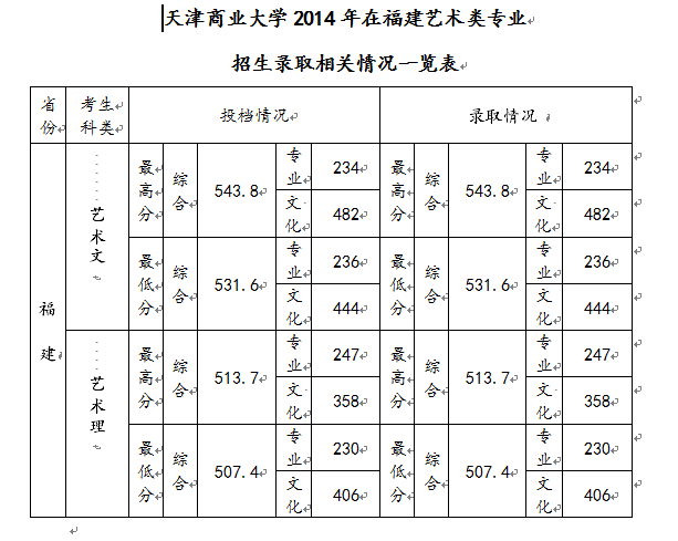[图文]2014天津商业大学福建艺术类录取分数线情况