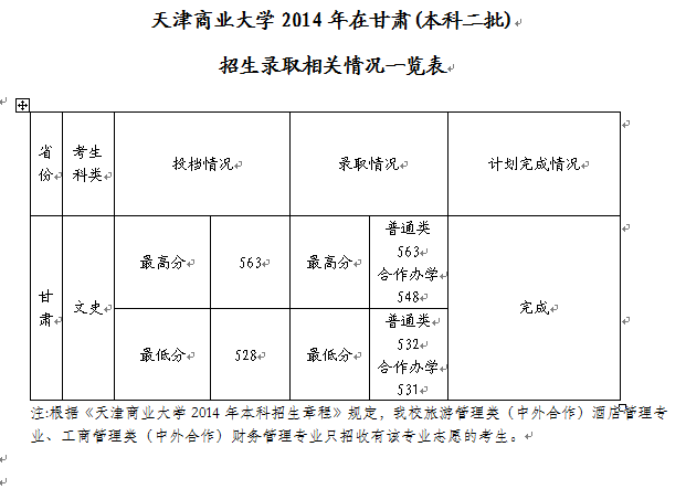 [图文]2014天津商业大学甘肃二本文科录取分数线情况