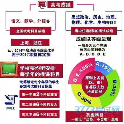 根据实施意见,实行高考综合改革的省份,高考成绩将包括语文、数学、外语等全国统考科目成绩和思想政治、历史、地理、物理、化学、生物等科目当中任选3科的考试成绩。上海、浙江已于今年启动高考综合改革,将于2017年整体实施。