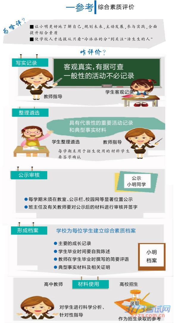 教育部16日出台的《关于加强和改进普通高中学生综合素质评价的意见》提出,学校要为每位学生建立综合素质档案,包含思想品德、学业水平、身心健康、艺术素养、社会实践五个方面的综合素质评价,高校将参考评价情况招生录取。