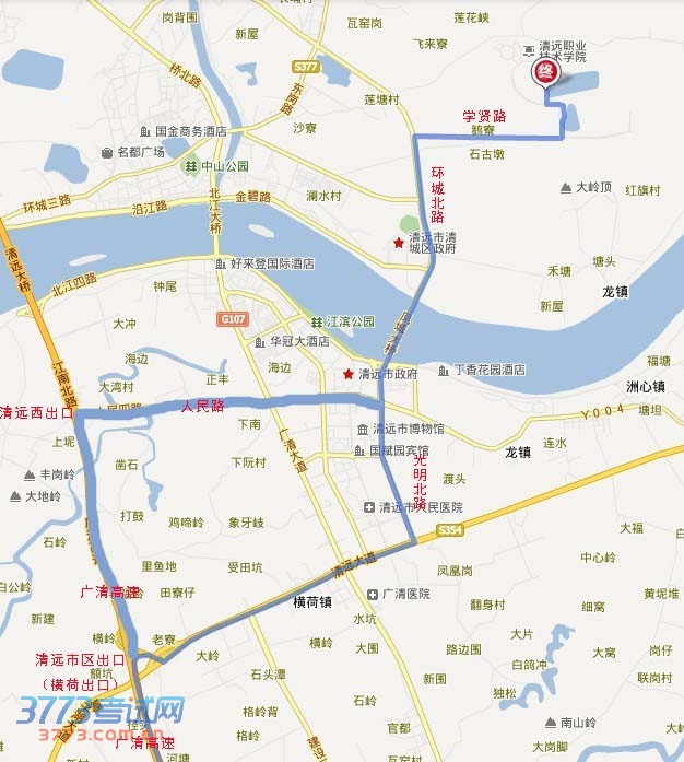 沿S272-高要市城区——沿G324行驶,朝三水/广州方向——广昆高速/广梧高速/G80——从广清高速/花都/清远/G107出口离开(经龙山收费站),朝花都/清远方向,进入广清高速——横荷出口-清远大道-光明北路-凤城大桥-环城北路(行驶约2.5公里)右转-学贤路-清远职业技术学院