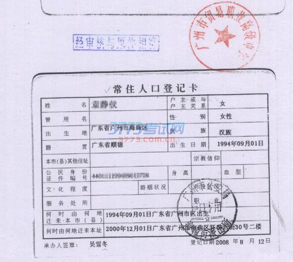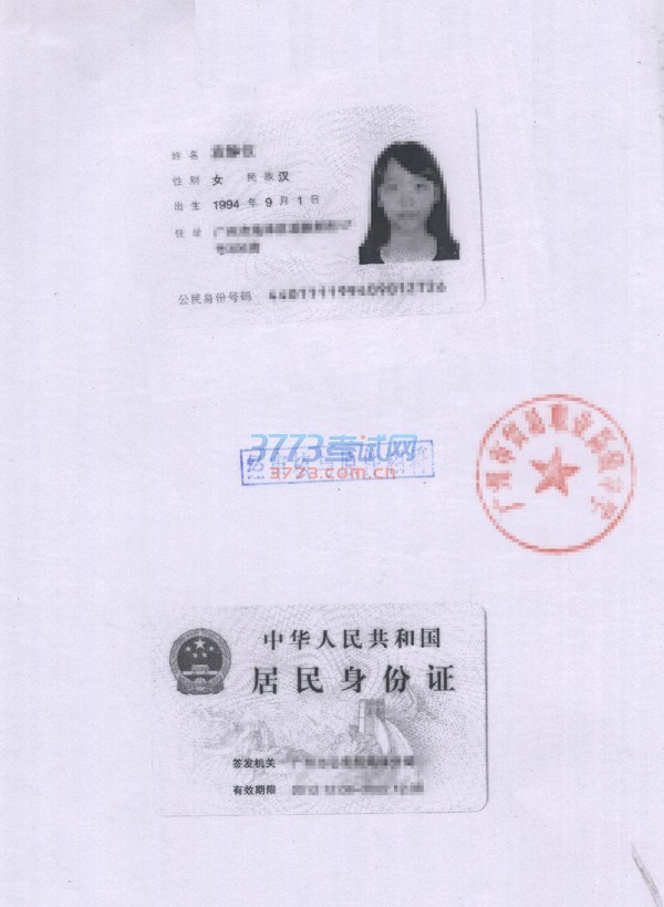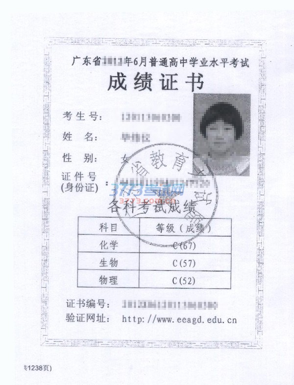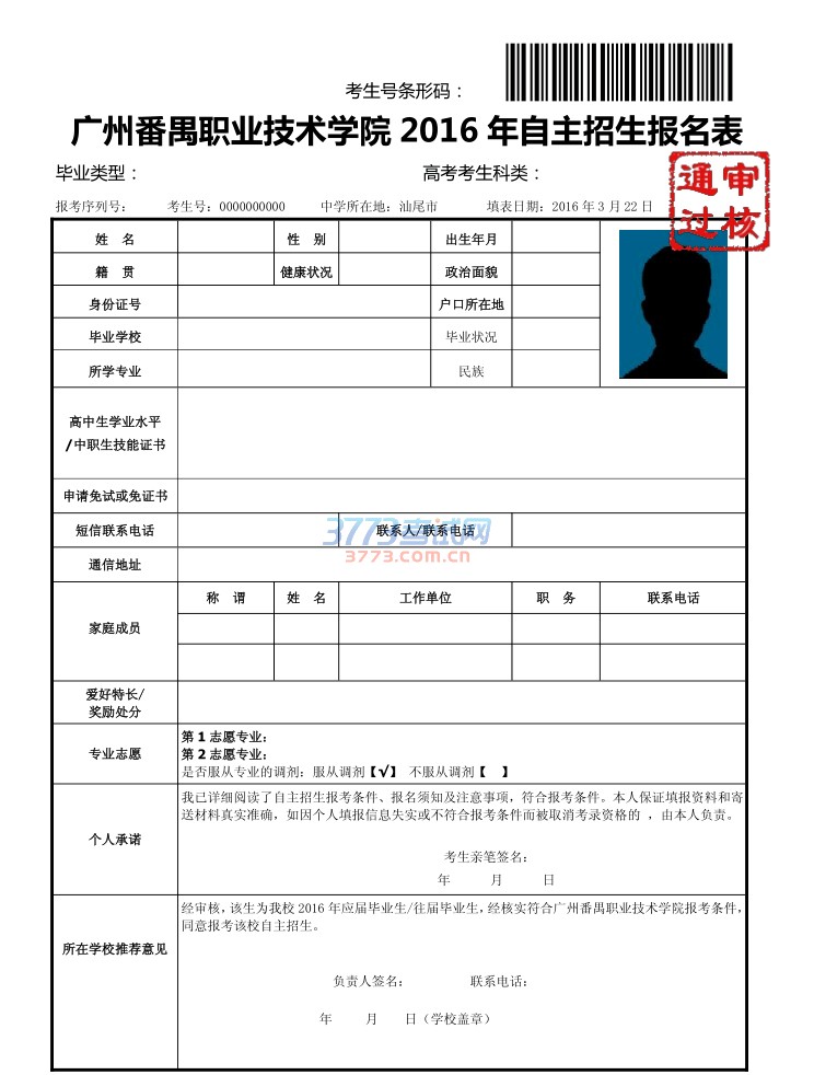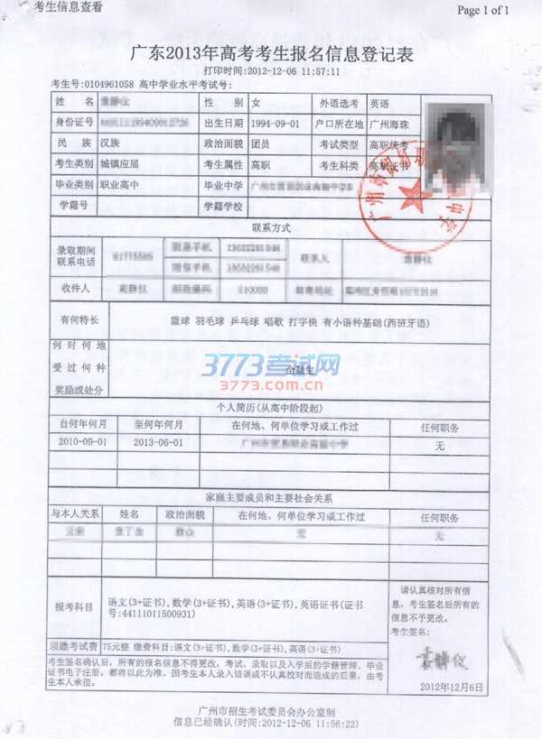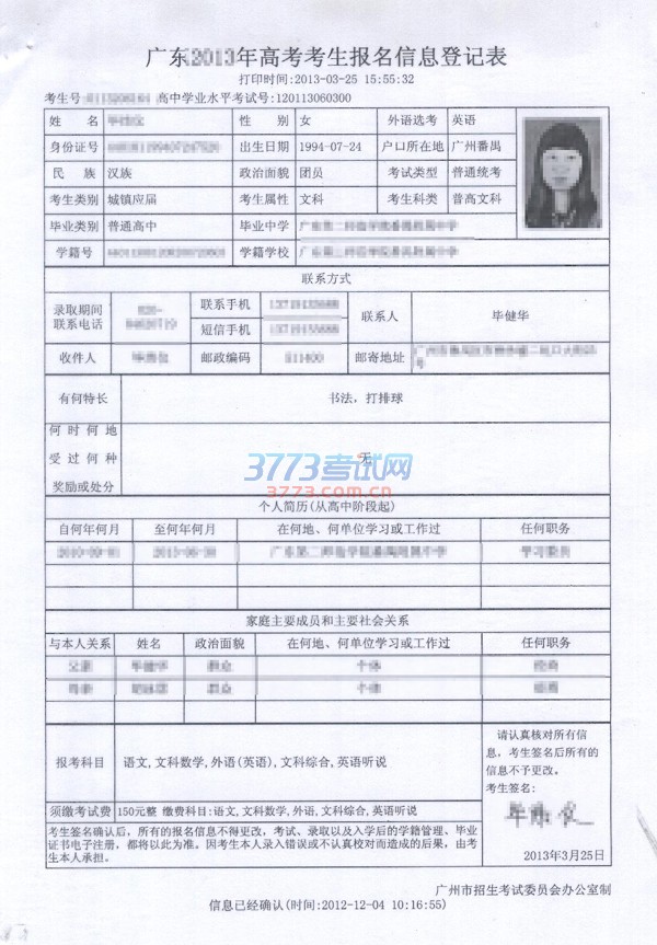 样板三:广东省2016年普通高等学校招生考试正式报名信息表(高考考生报名信息登记表)复印件;