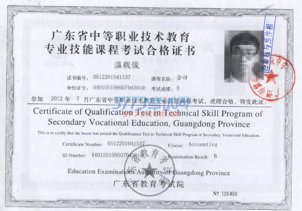 证书样板2:广东省专业技能课程合格证书复印样板。