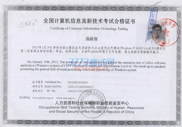 证书样板3:全国计算机高新技术考试合格证书复印样板。