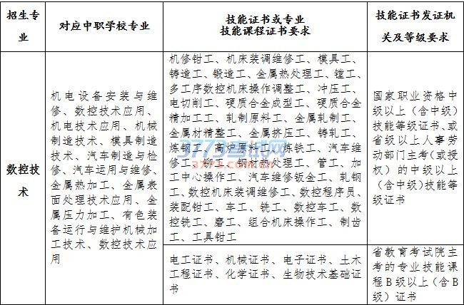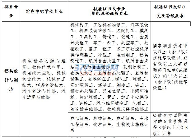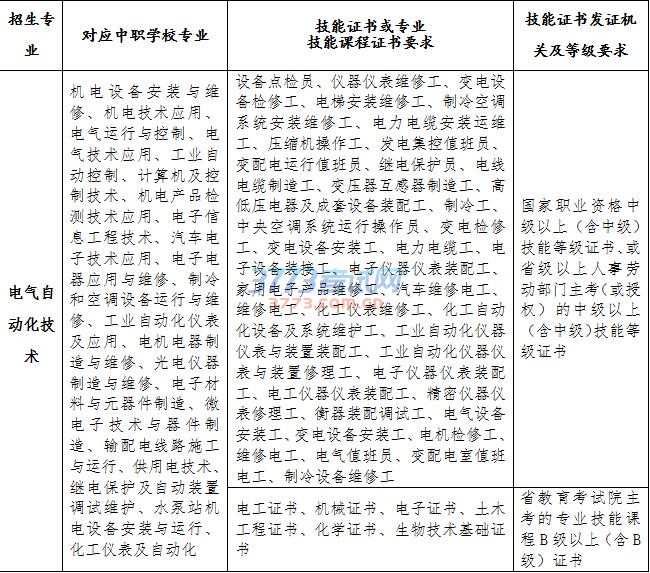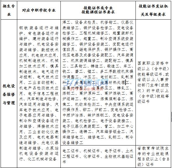 2.中职阶段所学专业与我校招生专业直接相关,并取得与招生专业相关的职业资格技能等级证书。职业资格技能等级证书原则上为国家职业资格中级以上(含中级)技能等级证书,或省级以上人力资源和社会保障部门主考(或授权)的中级以上(含中级)技能等级证书,或省教育考试院主考的专业技能课程B级以上(含B级)证书。