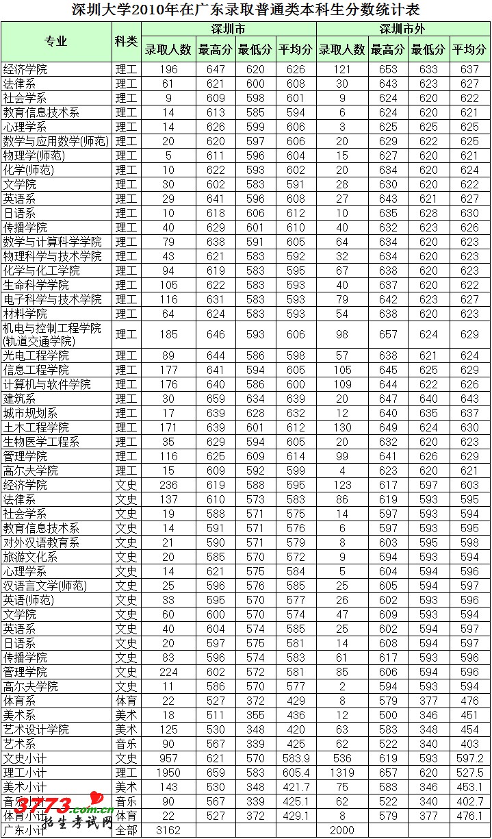 深圳大学2010年在广东录取分数线