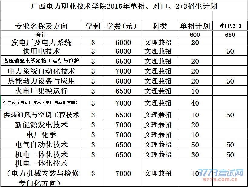 [组图]广西电力职业技术学院2015年单招、对口、2+3招生计划