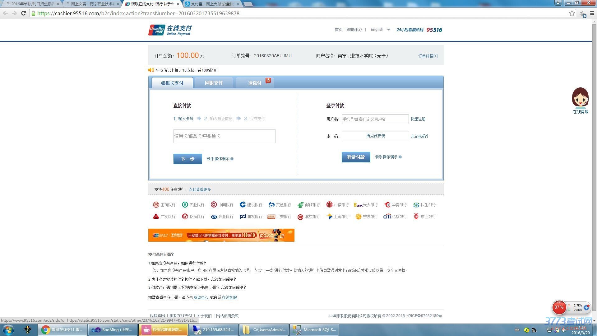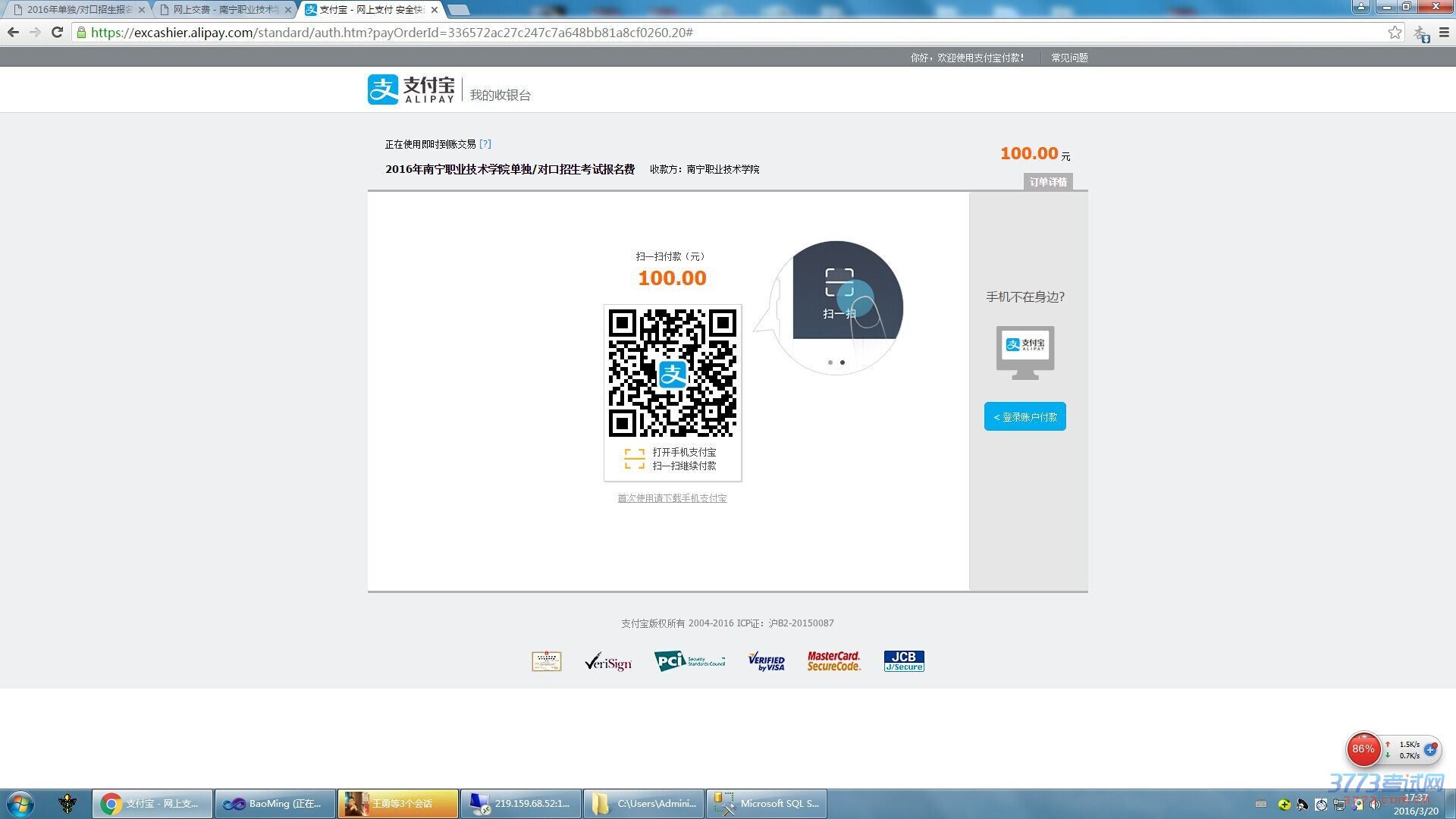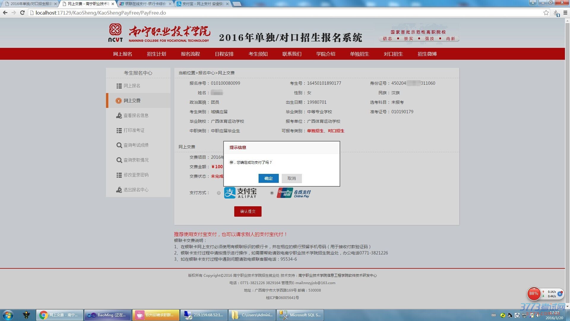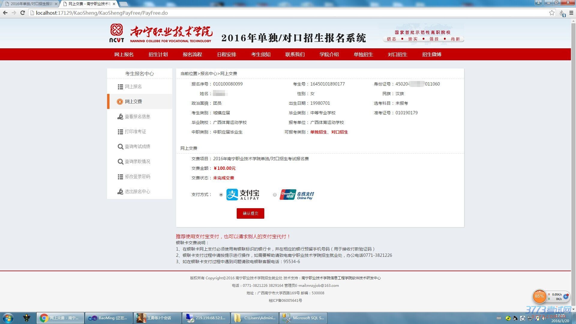 第二:提交完后,选择缴费方式(微信支付、支付宝、银联在线) 报名费:100元
