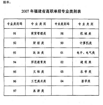 一、招生对象 高职单招对象为具有福建省户籍的中等职业学校(普通中专、职业中专、职业高中、成人中专、技工学校)应、往届毕业生。 二、报名时间、办法 报名时间为:l 2月1 8 P至12月22日,逾期不再受理。凡符合报考条件的应届毕业生由考生所在学校统一向学校所在地的县 (市、区)高招办(含考试中心,下同)办理集体报名手续,考生也可持学校出具的应届毕业生有效证明及本人有效身份证明到户口所在地的县(市、区)高招办报名;往届毕业生须持本人有效户口证明、身份证以及中职毕业证书原件和复印件到户口所在的县(市、区)高招办报名。考生填涂表(卡)的办法参照《福建招生资讯·2007年普通高考考生手册》,与普通高考考生相同。考生报名卡使用《福建省普通高等学校招生考生报名卡》,填(涂)时,除“选考语种”、“音乐、美术类考生是否参加全省组织的专业统一考试”等栏目外,其余栏目都必须认真填(涂)在填 (涂)“报考科类”栏目时,考生须按高职单招的十三个专业类别(见附件)选报其中一类。高职单招实行单列计划、单独命题、单独报名考试、单独录取的办法。报考高职单招的考生不能兼报普通高考。高职单招考生号的第九~十位为“专业类别码”,县(市、区)高招办应确保考生号编排的准确无误。有关中职学校及各县(市、区)高招办应切实做好本校或本地考生的招生考试宣传、咨询工作。 三、政审、体检及考生报考材料管理 高职单招考生的政审、体检办法与普通高考考生相同。应届中职毕业生政审工作由考生所在学校负责,往届中职毕业生政审工作由考生户口所在地的街道(乡、镇)或工作单位负责。考生体检由考生报名所在地县(市、区)招生委员会会同当地卫生部门组织实施。考生的报考资料管理办法与普通高考考生相同,具体由县 (市、区)高招办负责,统一采用普通高校招生考生报考资料袋,袋面须注明“高职单招”。考生报考资料包括:报名表及应届毕业生学校学历证明、往届毕业生毕业证书复印件。 四、考试 报考高职单招的考生参加省教育厅单独组织命题的“3+l”的考试。“3"为三门文化课,考试科目为语文、数学、英语,每门文化课考试成绩满分均为150分;“1”为一门专业基础知识(按高职专业属性分为13类),专业基础知识考试成绩满分为300分。考试工作由各设区市高招办负责组织实施。考试时间与普通高考相同,为2007年6月7日至8日,各科目考试时间安排以准考证规定的时间为准。高职单招考点须按相对集中的原则,由设区市高招办统一安排。考试结束后,答卷单独密封并移交评卷点。 五、填报志愿 考生填报志愿时间与普通高考志愿填报时间相同,志愿分为高职本科批和高职专科批。高职本科批:设一个第一志愿学校和五个有顺序的参考志愿学校,每所学校均设四个专业志愿;高职专科批:设一个第一志愿学校和七个有顺序的参考志愿学校,每所学校均设四个专业志愿。考生可填报同一专业类别中的六所高职本科学校和八所高职专科学校,每所学校四个专业。 考生志愿卡使用《福建省普通高校招生考生志愿卡(三)》(简称志愿卡三)。高职本科批志愿填报在“志愿卡三”专科提前批院校栏目中;高职专科批志愿填报在“志愿卡三”高职(高专)批院校栏目中。考生填涂表(卡)要求见(2007年福建招生资讯·普通高校招生计划合订本)中的“考生填报升学志愿须知”中的说明考生志愿表(卡)上交后,任何人不得更改,凡涂改的志愿或填(涂)在规定栏目以外的志愿均视为无效志愿。 六、录取 高职单招录取工作在省教育厅领导下,由省高招办会同有关学校共同进行。省高招办根据考生文化课和专业基础知识课总成绩,按招生计划数的一定比例确定最低录取控制分数线并报省招委会审批。录取工作继续实行计算机远程网上录取,实行“学校负责招办监督”的录取体制。 七、其他 认真做好高职单招招生考试工作,是促进我省高等职业技术教育健康发展的一项重要工作,各级招生部门和有关招生学校要高度重视这项招生考试的管理工作,根据本实施意见以及省招委会、省教育厅有关政策规定,精心组织,周密安排,严格要求,强化管理,确保高职单独招生工作的顺利进行