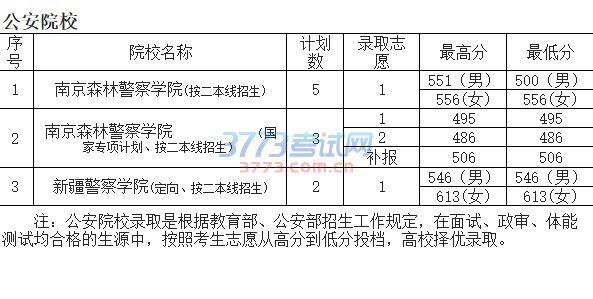注:公安院校录取是根据教育部、公安部招生工作规定,在面试、政审、体能测试均合格的生源中,按照考生志愿从高分到低分投档,高校择优录取。