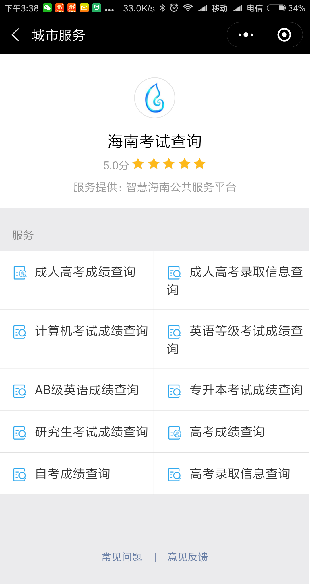 考生可用微信城市服务功能查询。打开微信,点“我”->“钱包”->“城市服务”->“教育”->“海南考试查询”。