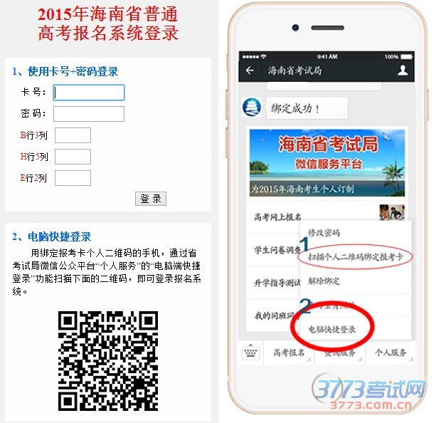 用绑定报考卡个人二维码的手机,通过省考试局微信公众平台“个人服务”的“电脑端快捷登录”功能扫描下面的二维码,即可登录报名系统。