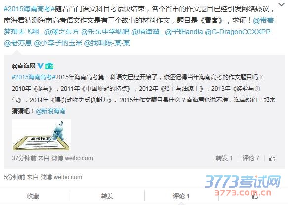 #2015海南高考#随着首门语文科目考试快结束,各个省市的作文题目已经引发网络热议,南海君猜测海南高考语文作文是有三个故事的材料作文,题目是《看客》,求证!@带着梦想去飞翔_ @澤之东方 @乐东中学贴吧 @琼海溜_ @子阳andla @G-DragonCCXXPP @老苏崽 @小李子的玉米 @我叫陈-某-某