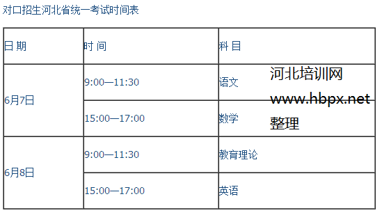 16.普通高等学校招生全国统一考试和对口招生河北省统一考试于6月7日开始举行,全国统考时间表由教育部发布,对口考试时间表由省招生委员会发布。考试时间表如下: