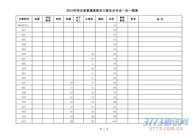 2015年河北省普通高校招生对口招生分专业一分一档表