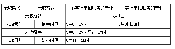 5月4日至11日,2015年高职单招录取备案工作全部通过远程网,在”高职单招信息管理系统”中进行,考生填报志愿与录取时间具体见下表: