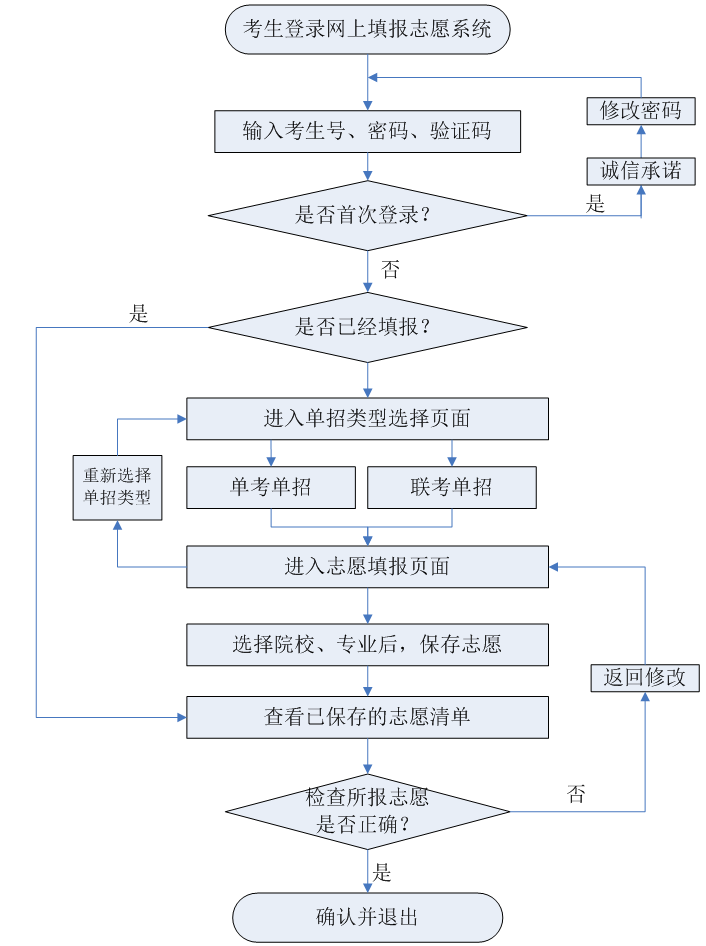 考生首次登录系统,须使用本人报名时所填报身份证号后8位作为密码进行登录,登录后必须先修改密码。请考生高度重视登录密码的设置和保管,密码设置不要过于简单,更不要将密码告诉别人,以防被他人篡改志愿,影响录取。