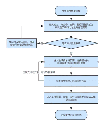 特别提醒:考生选择考试类后,系统将跳转到缴费页面,支付方式确定后,考试类等报考信息将不得更改,如未确定支付方式,可返回修改考试类等报考信息。报考结束后不再安排补报。不得跨考试类(含考试八类各细分类)报考、参加考试、填报志愿和录取。