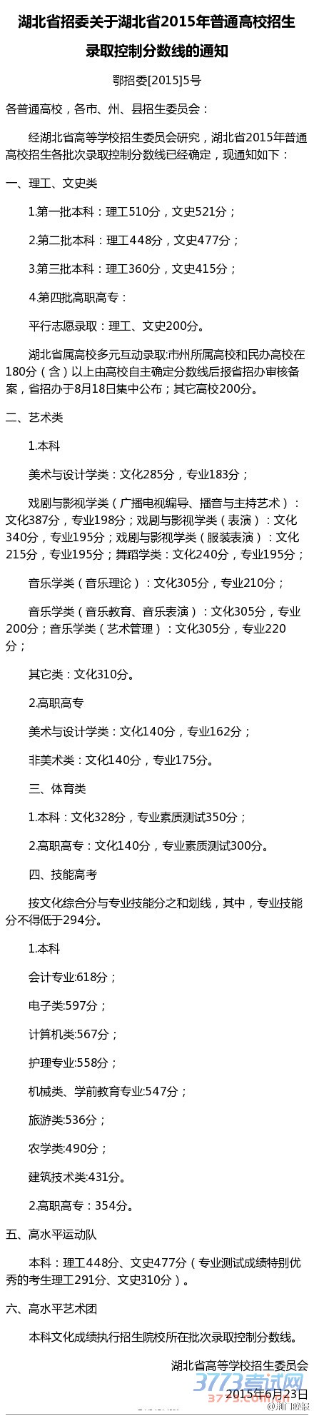 湖北省2015年普通高校招生各批次录取控制分数线出炉。第一批本科:理工510分,文史521分;第二批本科:理工448分,文史477分;第三批本科:理工360分,文史415分。