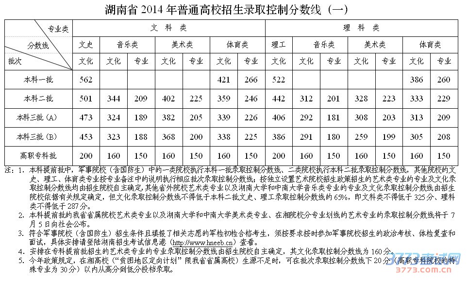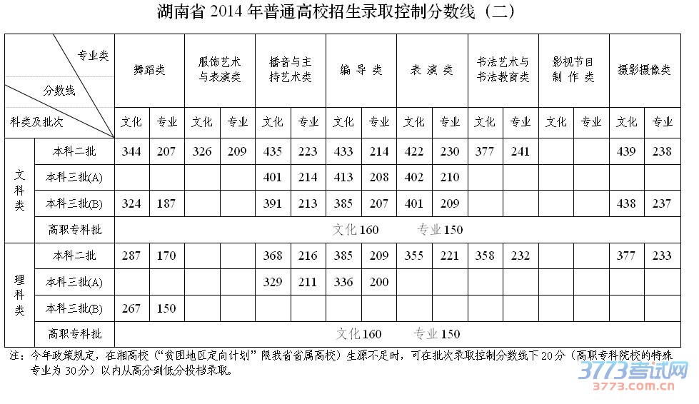 湖南省2014年普通高校职高对口招生录取控制分数线