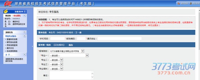 第四步:考生根据就读意向,可选择我校三个专业报考,并选择是否服从专业调剂,填写好本人的手机号码、通讯地址、邮政编码