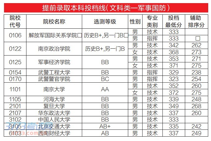 国防生招生类别中,投档线总体呈现女高男低的趋势,女生生源充足,投档分数线很高,而男生计划出现很多缺额。江苏省教育考试院专家分析发现,军事院校、国防生有缺额的主要为按本一线录取的军事指挥类计划,均为男生计划。