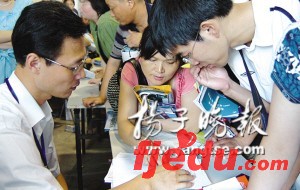 专家点评:苏北一所专科学校的招办负责人表示,到填报志愿的第二阶段,江苏考生不愿离家出省的愿望更加强烈。江苏尤其是南京高校报考者很多,投档线很高。在现场,记者了解到,南京不少专二学校给出的预估线都在480分以上,而苏北专二类学校的预估线多在450分左右。如果考生一窝蜂填报南京的学校容易撞车,减少被录取的可能。专家建议,比如填报专一志愿时,考生可以填一到两所南京的学校,再填报苏南的学校,第三档次是苏北的学校,最后把外省偏远地区学校作为保底,这样“中签率”会大大提高。撰稿 实习生 韩 钧 本报记者 王璟 蔡蕴琦 摄影 裴 睿