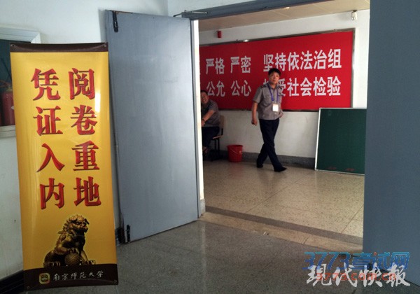 江苏高考还没有结束,但阅卷已经开始。南师大紫金校区的综合实验楼6楼,语文阅卷组专家已经开始试评卷,研究打分细则。南师大紫金校区阅卷点,楼梯间也有保安把守。现代快报记者 金凤/文 徐洋/摄